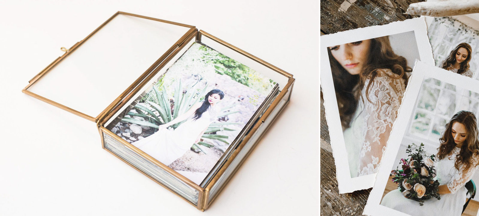 Our GLASS DISPLAY PRINT BOX is a beautiful heirloom photo presentation. Handmade boxes of glass and brass with an antique gold, tarnished silver or rose gold finish. The perfect home for your prints. Your box will be complete with a set of prints created from Cotton Rag Etching paper with hand-torn edges for a romantic finish.